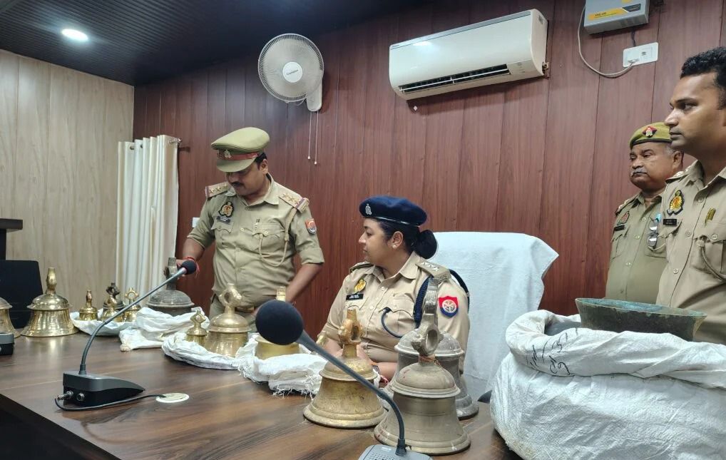 चहनियां। बलुआ थाना क्षेत्र में लगातार चोरो द्वारा मन्दिरों को निशाना बनाया जा रहा था जिससे लोगों में आक्रोश पनपने लगा था जो पुलिस के लिए सिरदर्द बन गया था कि मुखबीर की सूचना पर पुलिस ने पूरागनेश गांव निवासी एक व्यक्ति को गिरफ्तार उसके निशानदेही 14 बड़े-छोटे घंटे व एक पीतल का गगरा बरामद किया।