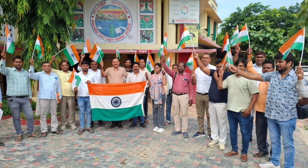 सकलडीहा। कस्बा स्थित पीजी कॉलेज में राष्ट्रीय सेवा योजना के तत्वाधान एवं उत्तर प्रदेश शासन के निर्देशानुसार “हर घर तिरंगा- 2025” कार्यक्रम के अंतर्गत बुधवार को महाविद्यालय के प्राचार्य प्रोफेसर प्रदीप कुमार पांडेय के नेतृत्व में तिरंगा रैली का आयोजन किया गया, जिसमें महाविद्यालय के समस्त प्राध्यापक एवं कर्मचारी तथा छात्र-छात्राओ ने हिस्सा लिया।