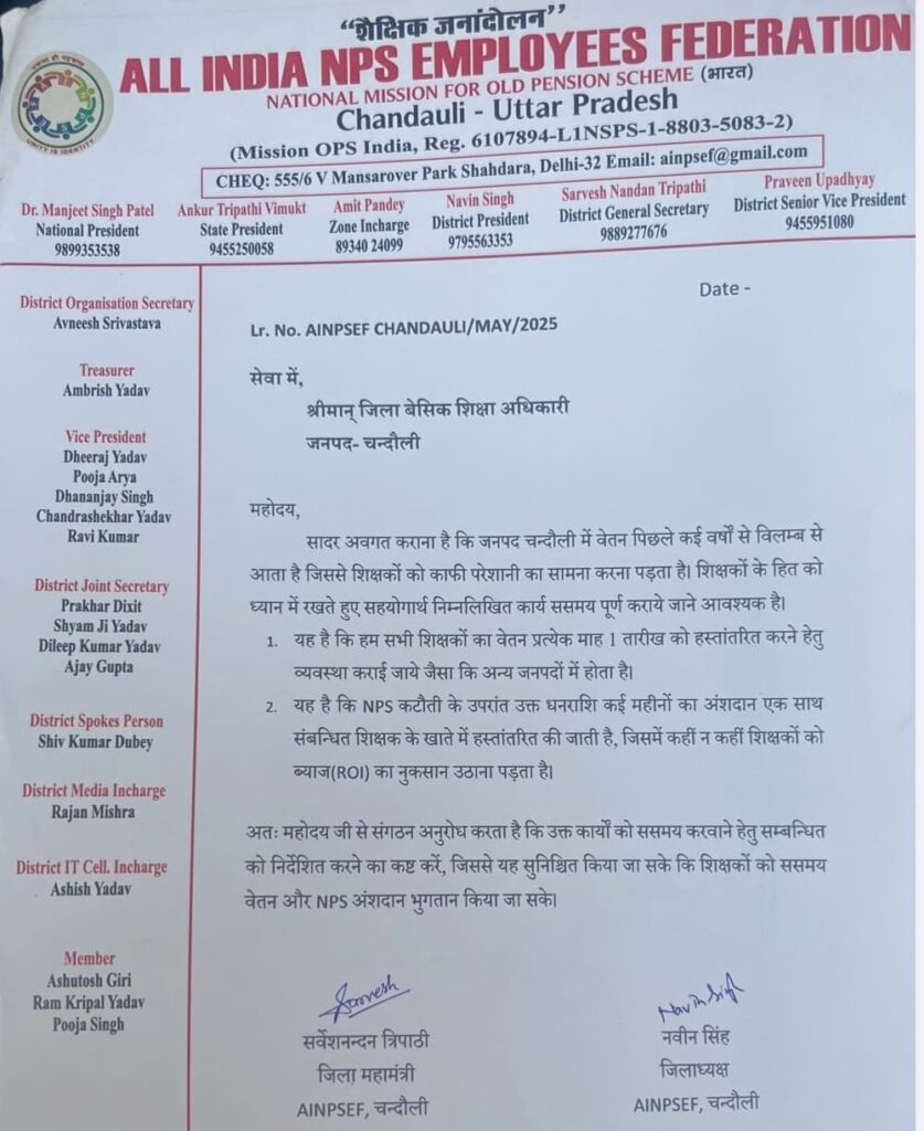चंदौली। शिक्षकों का वेतन भुगतान समय से न होने एवं एनपीएस के अंशदान का विलम्ब से क्रेडिट होने से होने वाले नुक़सान को लेकर ऑल इंडिया एन पी एस एम्प्लॉयज़ फेडरेशन ने सोमवार को बेसिक शिक्षा अधिकारी को एक ज्ञापन दिया। तथा इस पर शीघ्र कार्यवाही करते हुए सुधार की मांग किए। बेसिक शिक्षा अधिकारी सचिन कुमार ने इस समस्या के समाधान हेतु हरसंभव मदद का आश्वासन दिया।